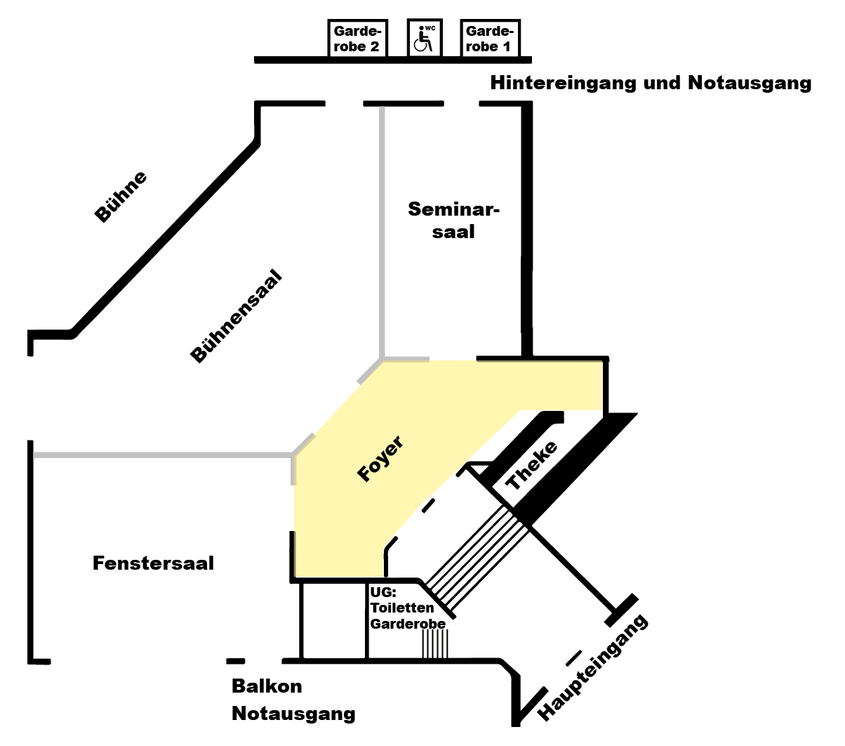 im Foyer vor den Sälen findet sich genügend Platz für einen Sektempfang. Eine feste Kühltheke mit Spülmaschine kann mitbenutzt werden.